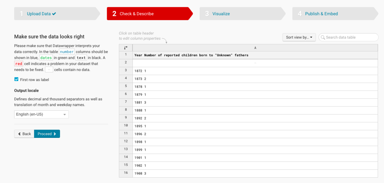 Once you’ve deleted the extra semicolons and spaces (as you can see I started to do in the screenshot above), click on “Proceed” to take you to the “Check and Describe” page, checking to see if your data is now formatted correctly, displaying blue text for numbers and green for labels.